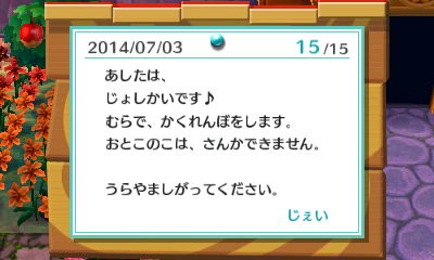 とびだせどうぶつの森を始めたので。 スローライフを綴ってみます。 村長は『じぇい』です。
